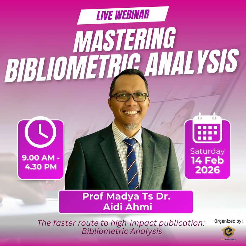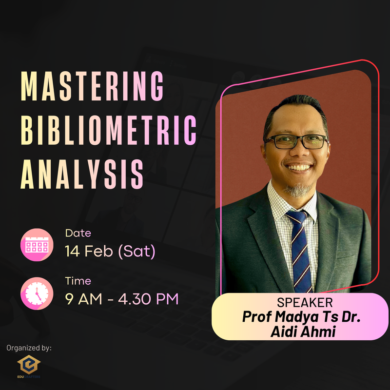 Untuk membantu anda menguasai kemahiran ini, kami membawakan webinar Mastering Bibliometric Analysis yang akan dibimbing oleh pakar yang tidak asing lagi dalam bidang ini, Dr. Aidi Ahmi. Beliau dikenali dengan kepakaran menggunakan pelbagai perisian bibliometrik dan teknik penyampaian yang menjadikan statistik kompleks kelihatan mudah difahami.